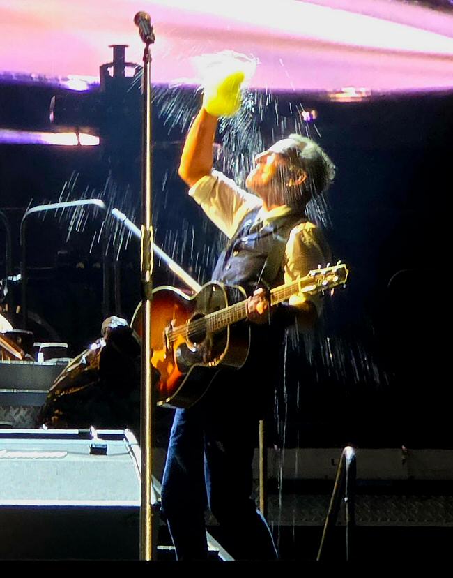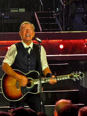 “Ik weet niet precies hoelang de pauze heeft geduurd. Het onweer, het leek wel vuurwerk, was snel voorbij gelukkig, maar het hoosde nog wel een tijdje. Toen de roadies uiteindelijk weer het podium opkwamen om plastic en water te verwijderen, leken er wel watervallen vanaf te komen. Bruce had zich in tussentijd nog een keer laten zien om het publiek aan te moedigen door te zingen. Want, zo heb ik het tenminste beleefd, het stadion bleef massaal juichen en zingen. En toen gebeurde wat ik al eerder bij Springsteen heb gezien als er iets onverwachts gebeurt en de boel weer op gang gebracht moet worden (denk bijvoorbeeld aan de stroomstoring in Parijs): het gas helemaal indrukken.